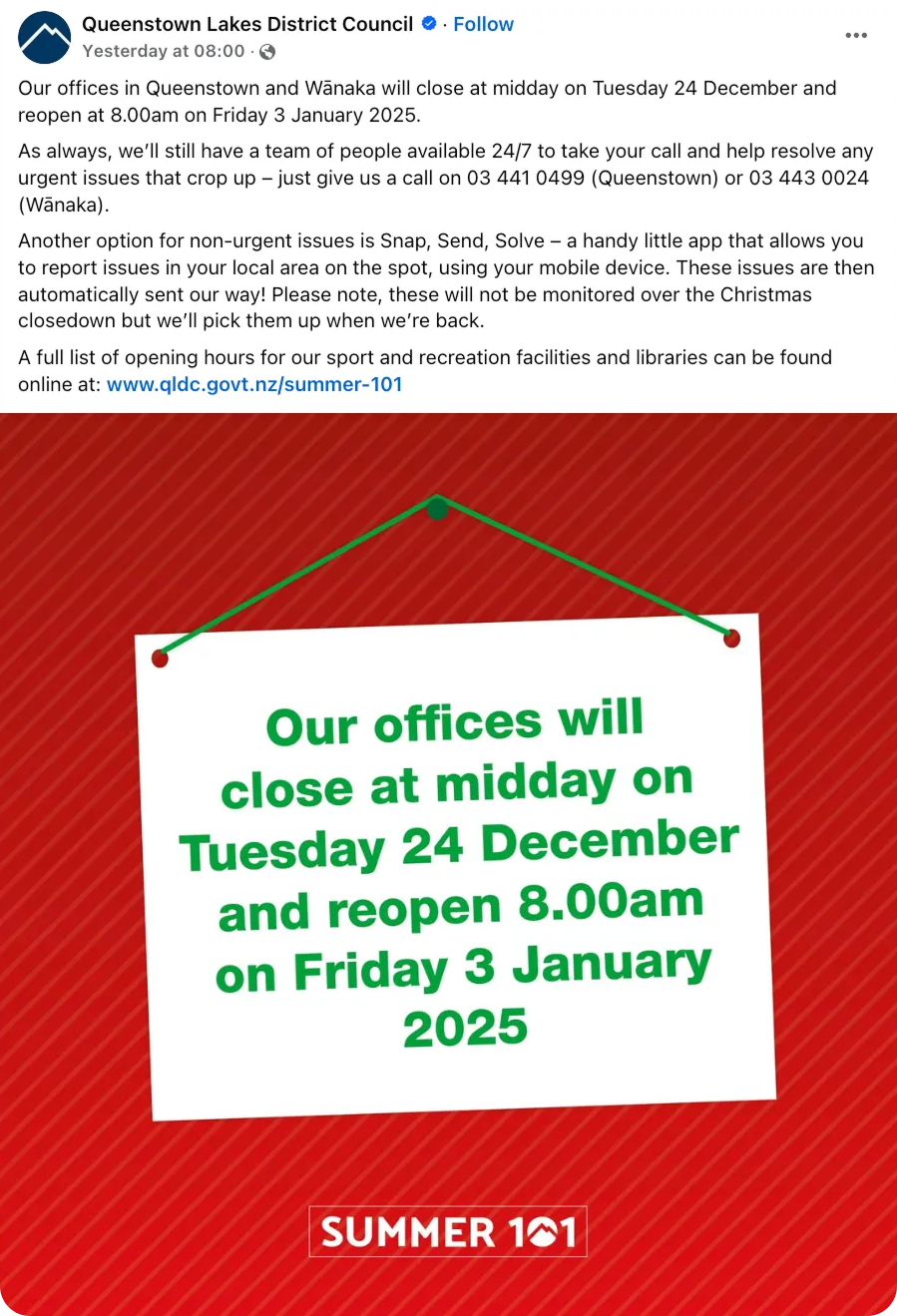 Queenstown Lakes District Council shared their closure details well in advance, outlining who to contact for urgent issues and encouraging residents to use Snap Send Solve for everything non-urgent.