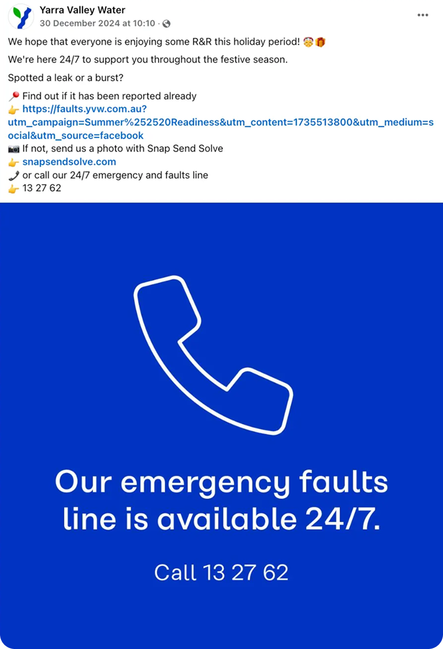 Yarra Valley Water took a proactive approach too, reaffirming that their 24/7 operations continue through the holidays while guiding customers to Snap Send Solve for all non-urgent issues.